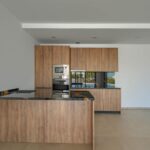The living area flows naturally onto the outdoor terrace, where a partially covered lounge and dining space overlook the 8x4m swimming pool—perfect for relaxing or entertaining. A modern, fully equipped kitchen with a central island sits next to the dining area, creating a practical and inviting space.