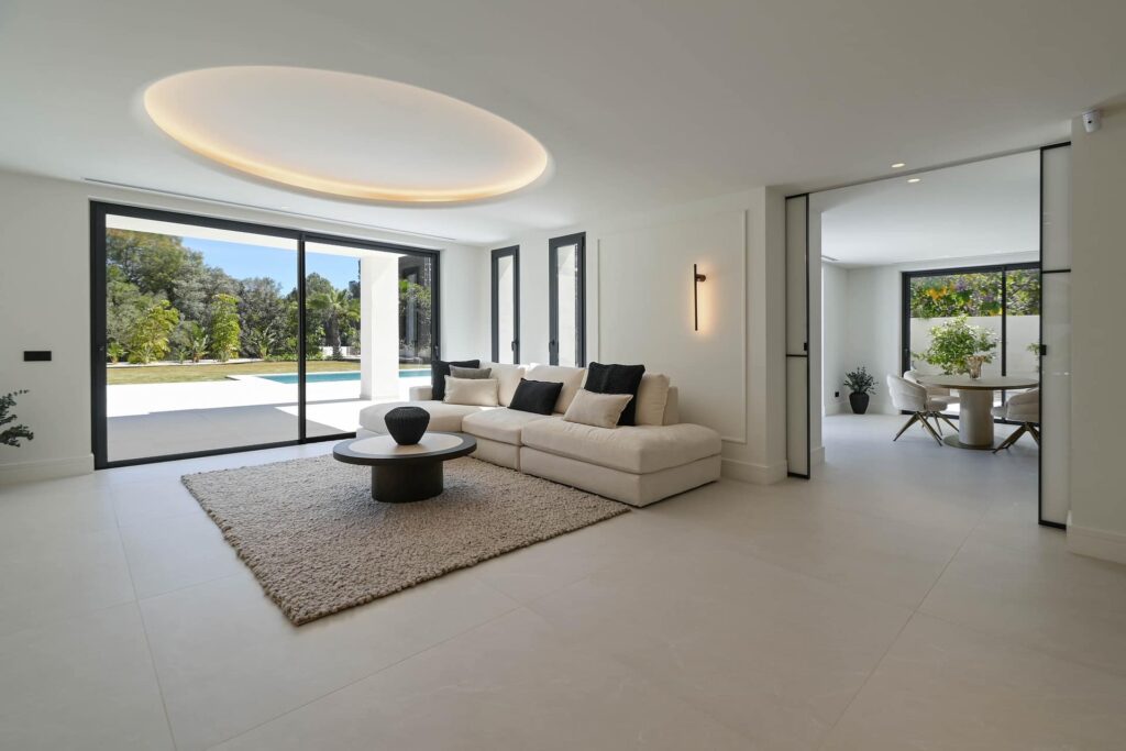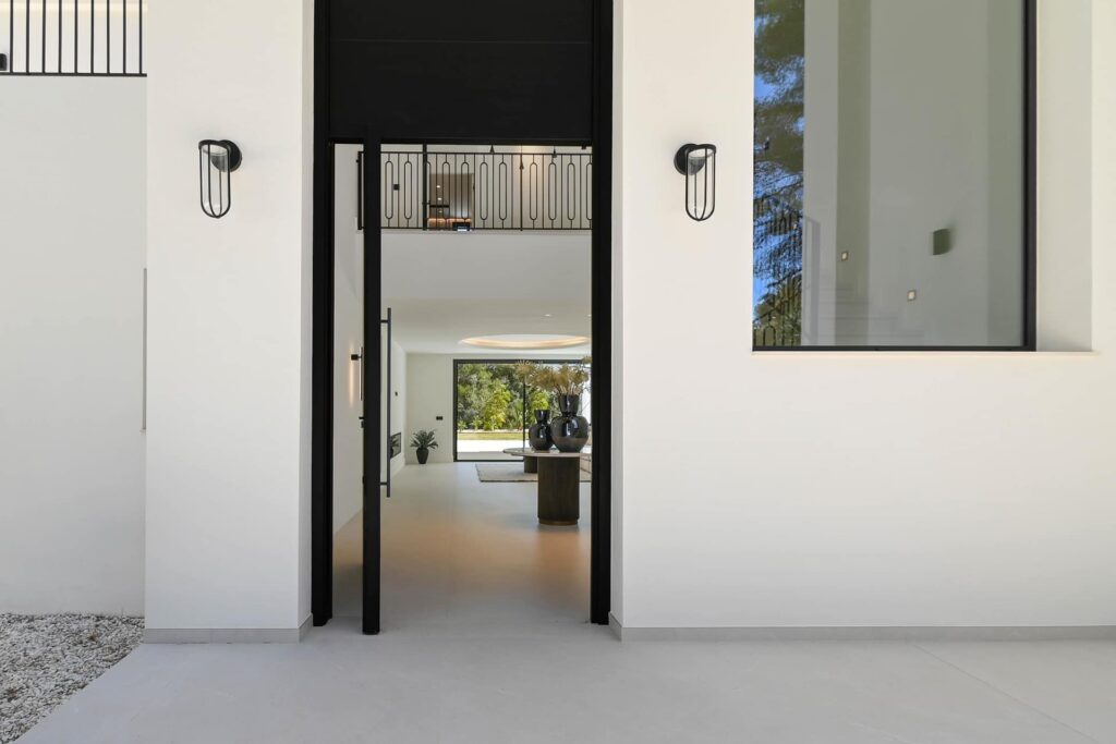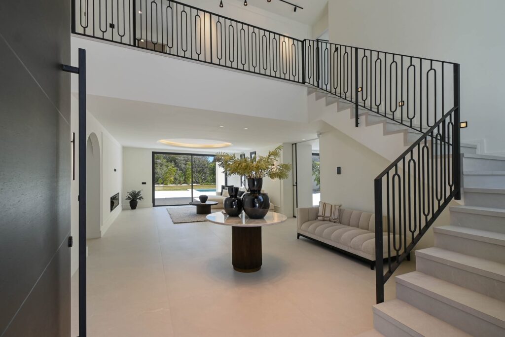 At the heart of the villa, In the principal reception room, a dramatic statement light hangs from the double-height ceiling, drawing the eye upward and amplifying the scale and sophistication of the space. Custom ADL white glass, metal framed interior doors further enhance the refined contemporary aesthetic while a fully integrated domotica system provides intuitive control of lighting, climate, and security. Throughout, subtle moldura detailing adds texture, depth, and understated elegance enhancing the walls and ceilings, bringing depth, character, and a quiet sense of craftsmanship that sets this home apart.