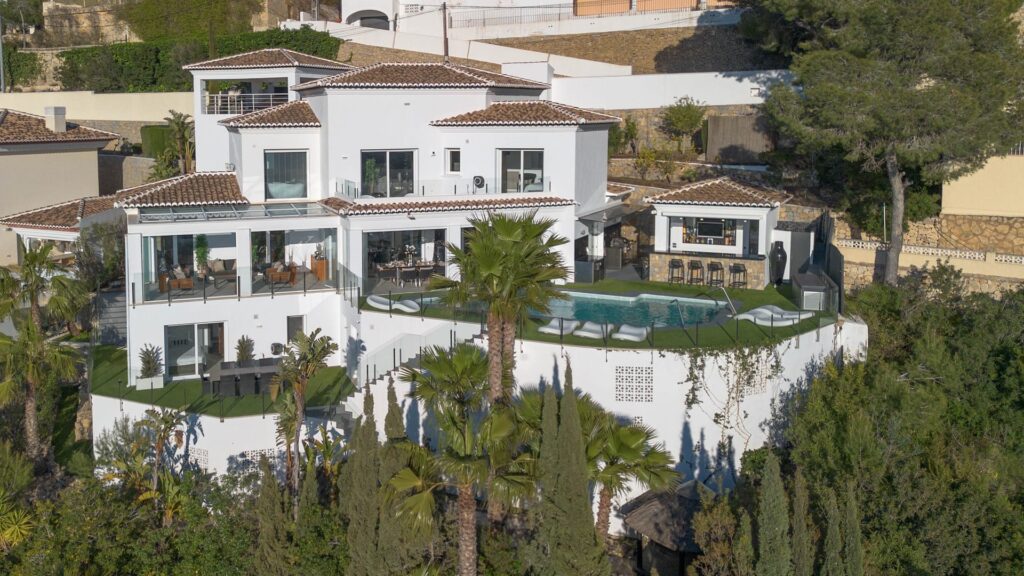 A well-equipped outdoor bar and kitchen invite long, unhurried evenings, while the poolside dining area promises relaxed entertaining in true Costa Blanca style. The exterior lounge, complete with an electric roof, adapts effortlessly to the moment—creating a refined space for conversation, comfort, and effortless living.