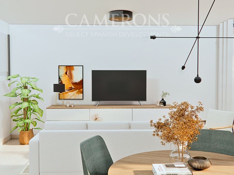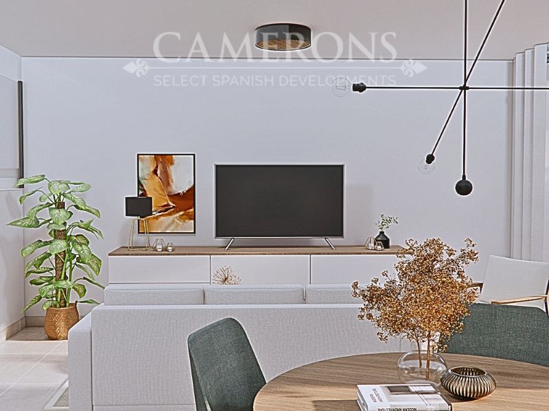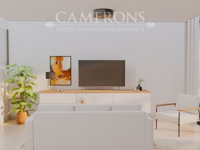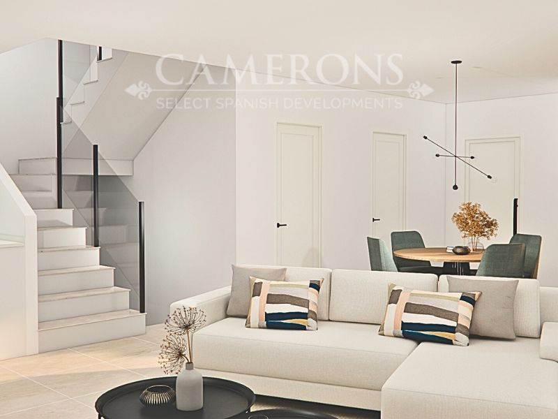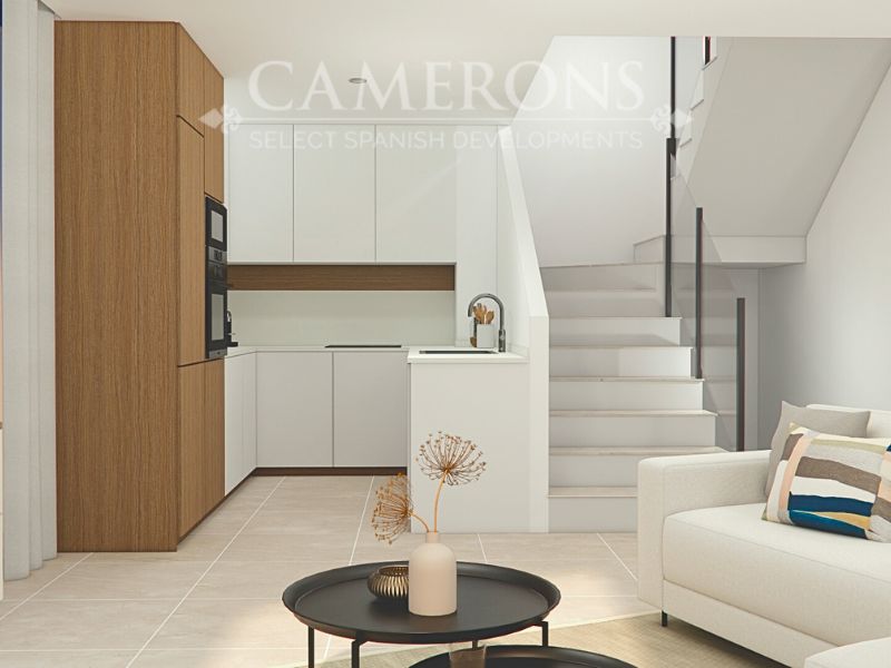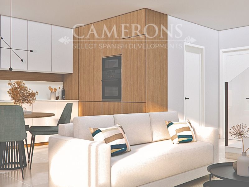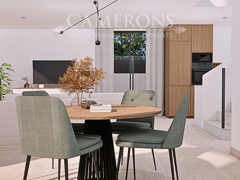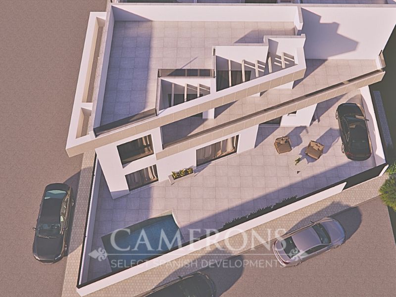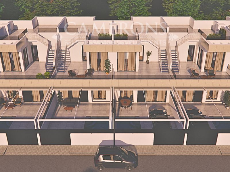 New complex of 15 terraced villas, with off-street parking, private pools and large terraces. These 3-bedroom, 2.5-bathroom, modern properties are being constructed in a residential area in Rojales. The houses have 2 floors, with the master bedroom en-suite on the ground floor and separate W.C. The kitchen is to the side with an open plan dining and living room with 3 patio doors affording lots of light. On the first floor there are a further 2 bedrooms and a family bathroom and a large 20m2 first floor terrace.