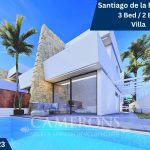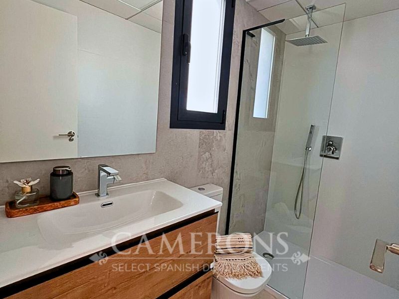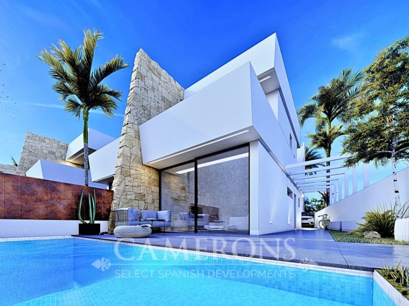 The villas boast 3 generously sized bedrooms (first floor with en-suite), and a further bathroom on the ground floor with walk in shower. The ground floor living area features a fully fitted kitchen with drop down table open plan lounge / dining area, fully fitted kitchen zone with appliances, exterior storage room and terraced areas to the side of the villa, from master bedroom and from the lounge area.