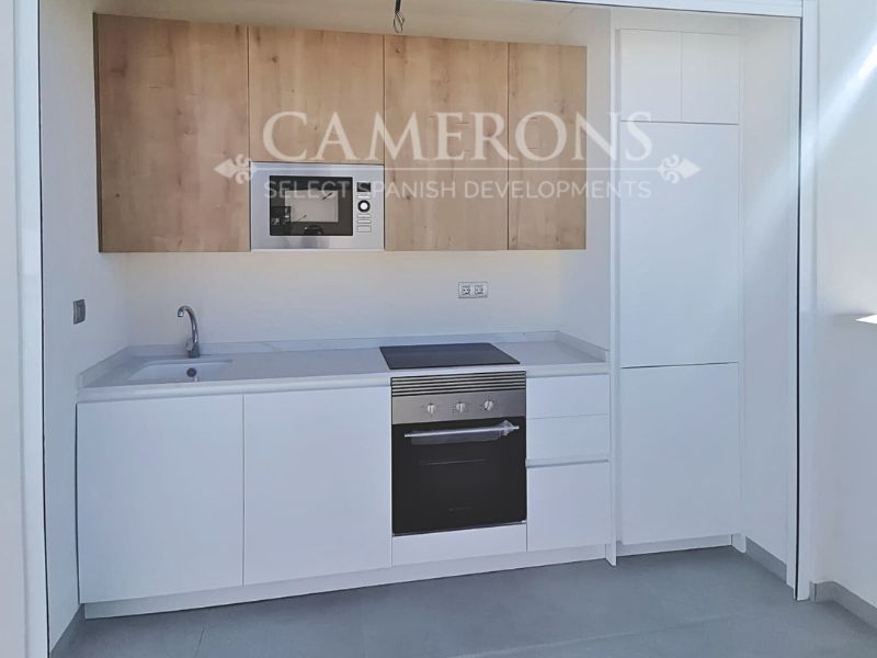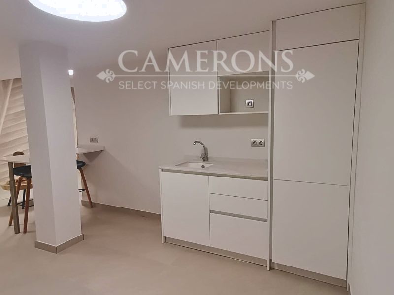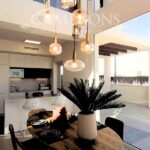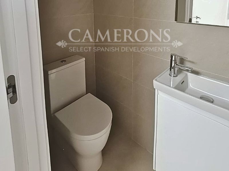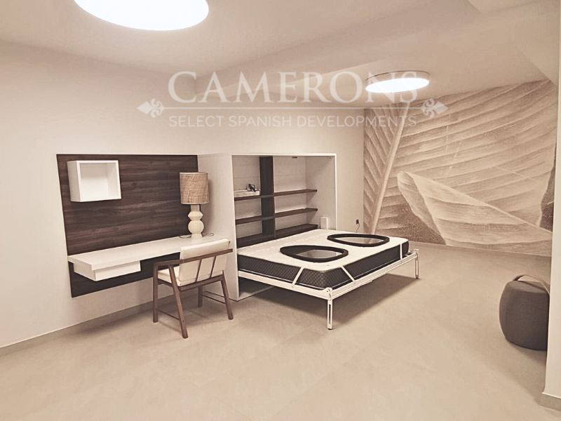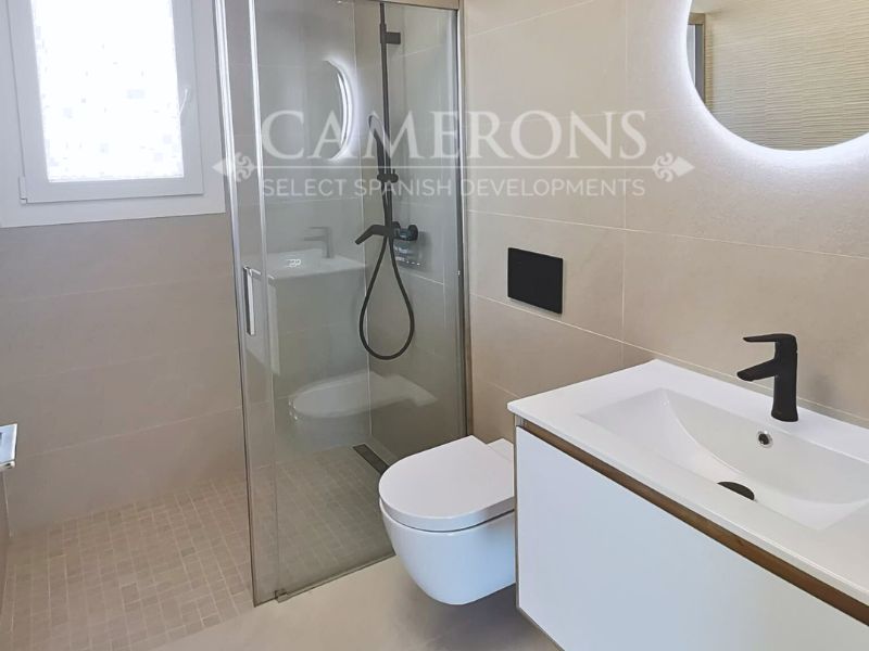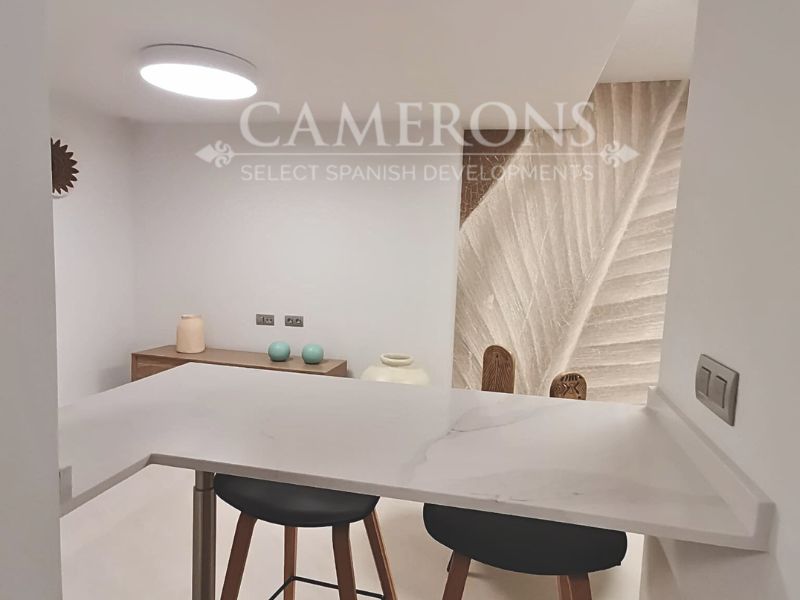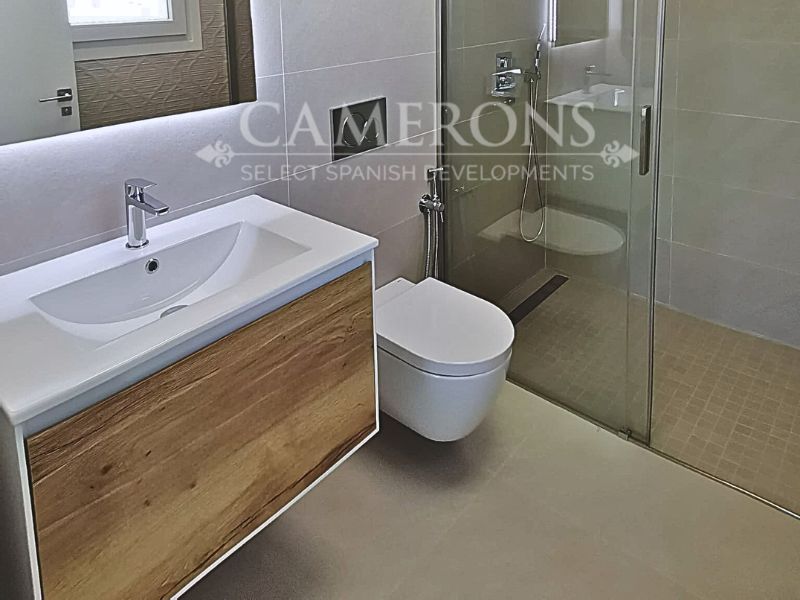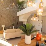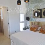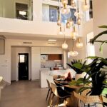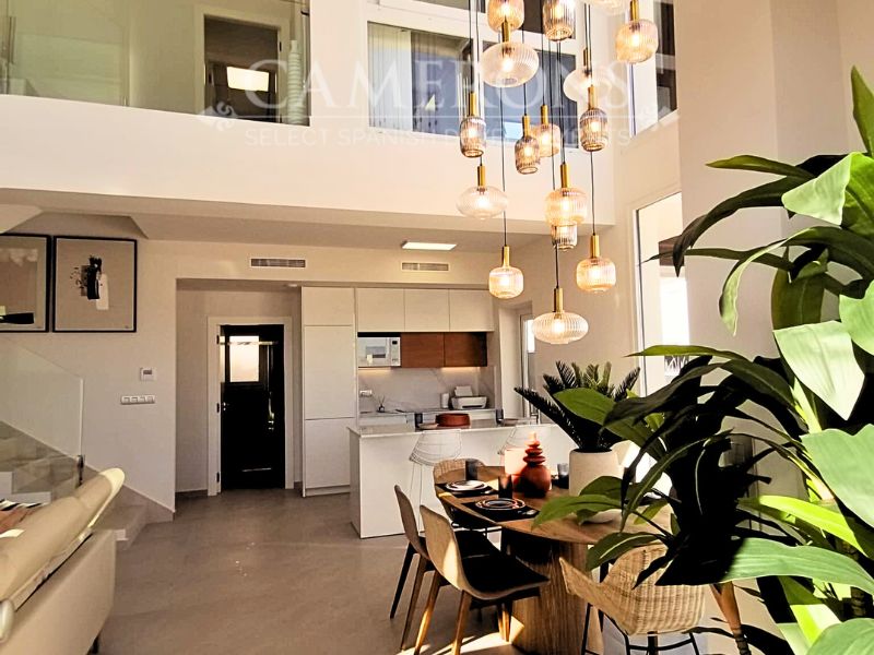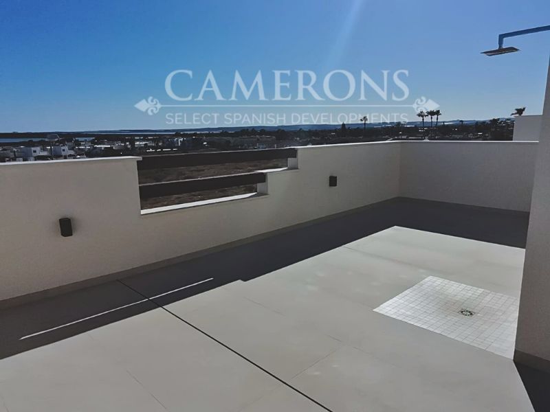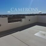 These properties have 3 bedrooms and 3 bathrooms, the featuring double height ceiling in the living room affording lots of light throughout the house. 1 bedroom and family bathroom on the ground floor with an open plan living area/dining and kitchen leading out to a fully landscaped garden and private pool area and off-street parking. Stairs lead up to the first floor with 2 further bedrooms, both en suite, continuing up to a rooftop solarium of 45m2 and great views of the surrounding area.