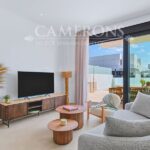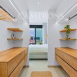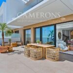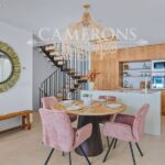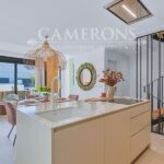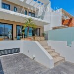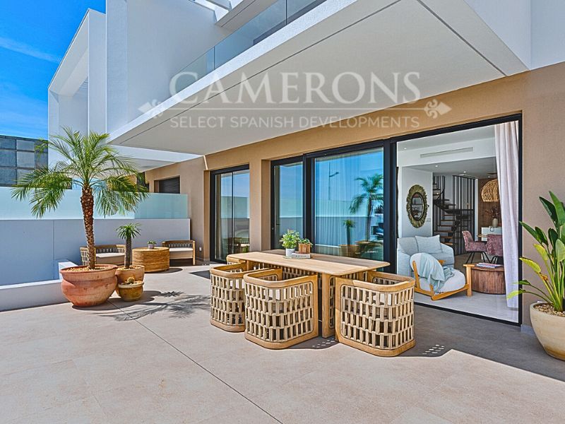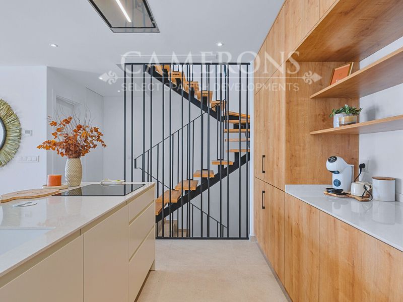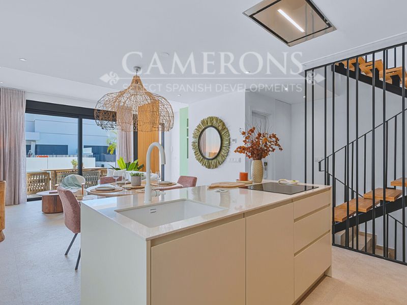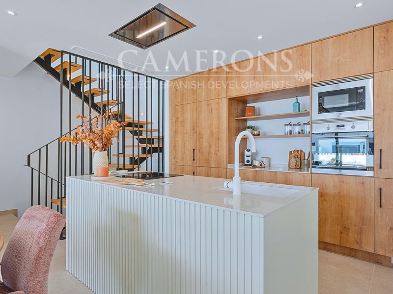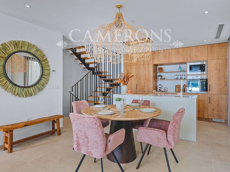 On the ground floor there is a larger master suite with a walk-through wardrobe and a good sized en-suite, an open plan kitchen with an island/breakfast bar, dining and living room with a handy guest toilet; large patio doors lead from the living area to the terrace and pool area. On the first floor there are two bedrooms with access from both of them to a big bathroom and also a good size 20m2 terrace to enjoy the sun.