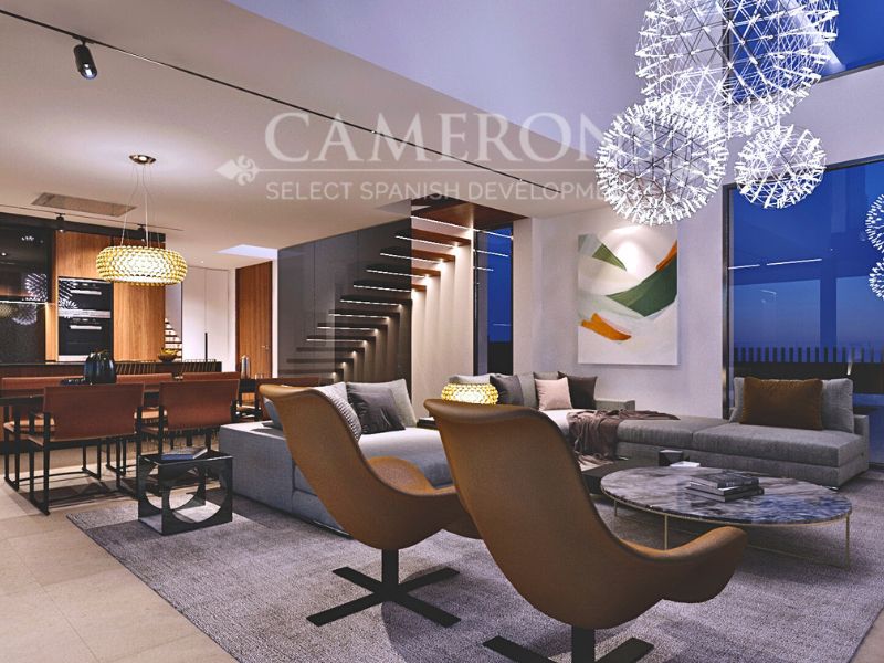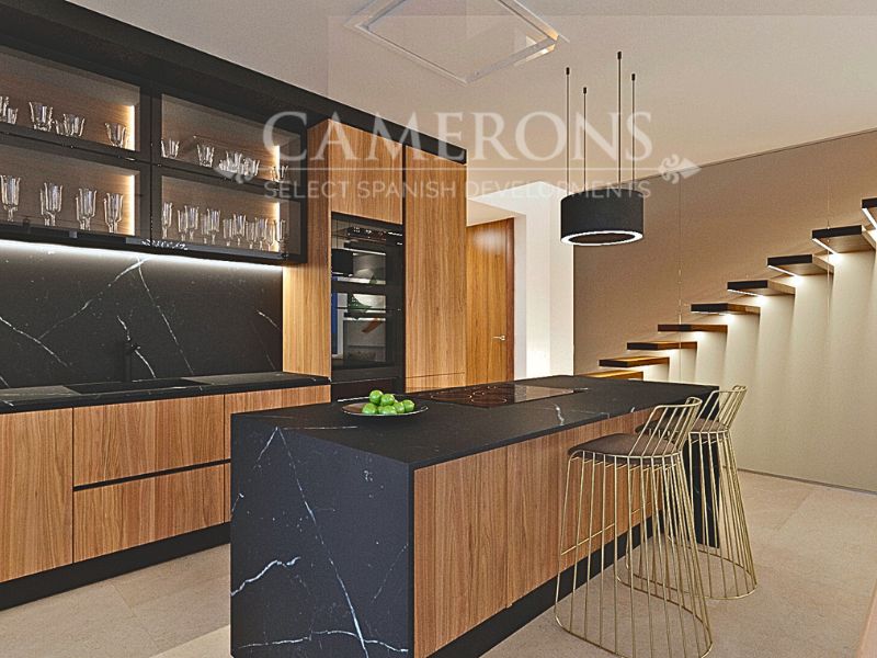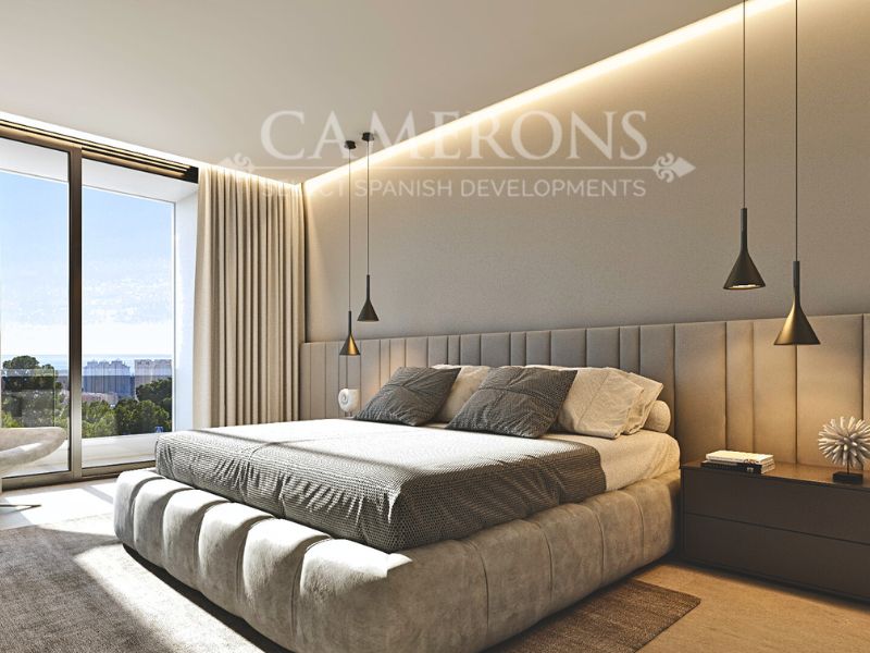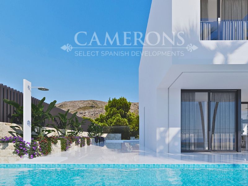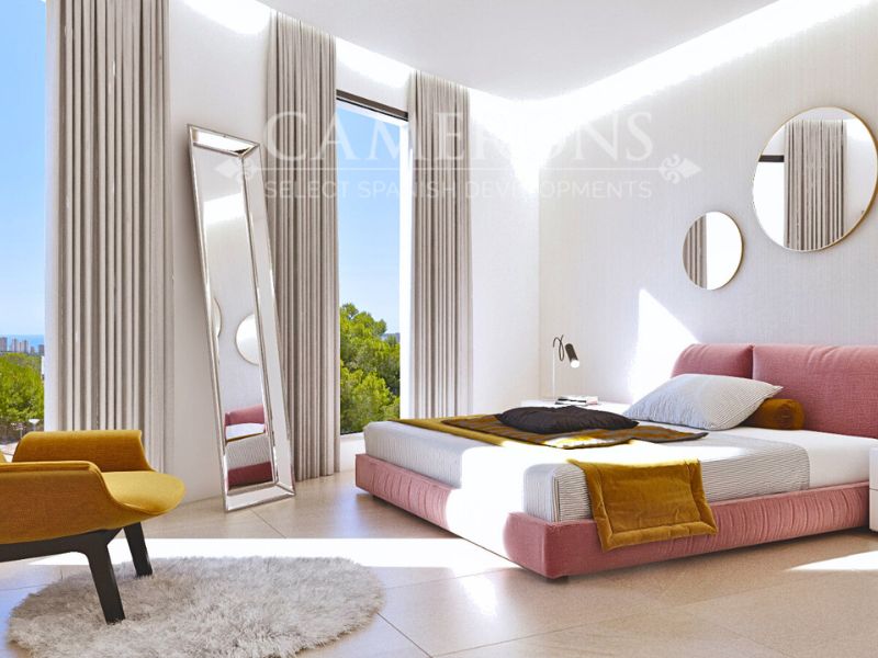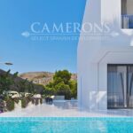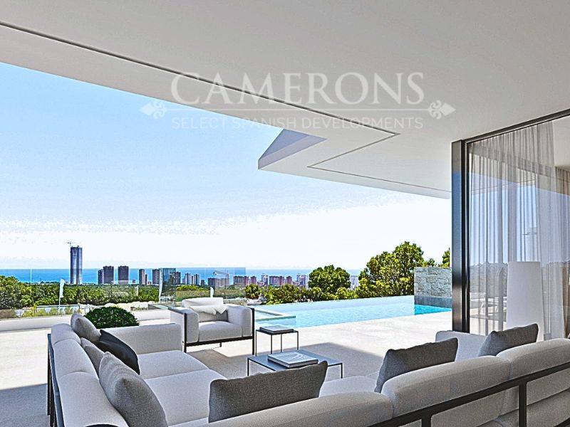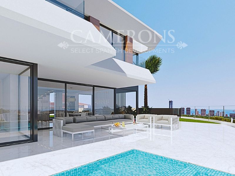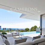 The detached villa, on a 598 m2 plot, boasts 5 bedrooms and 5 bathrooms. The modern design of the bright and open lounge, dining and kitchen, is complimented with the spacious external terraces, basement and pool area, with fantastic sea views and Benidorm skyline.